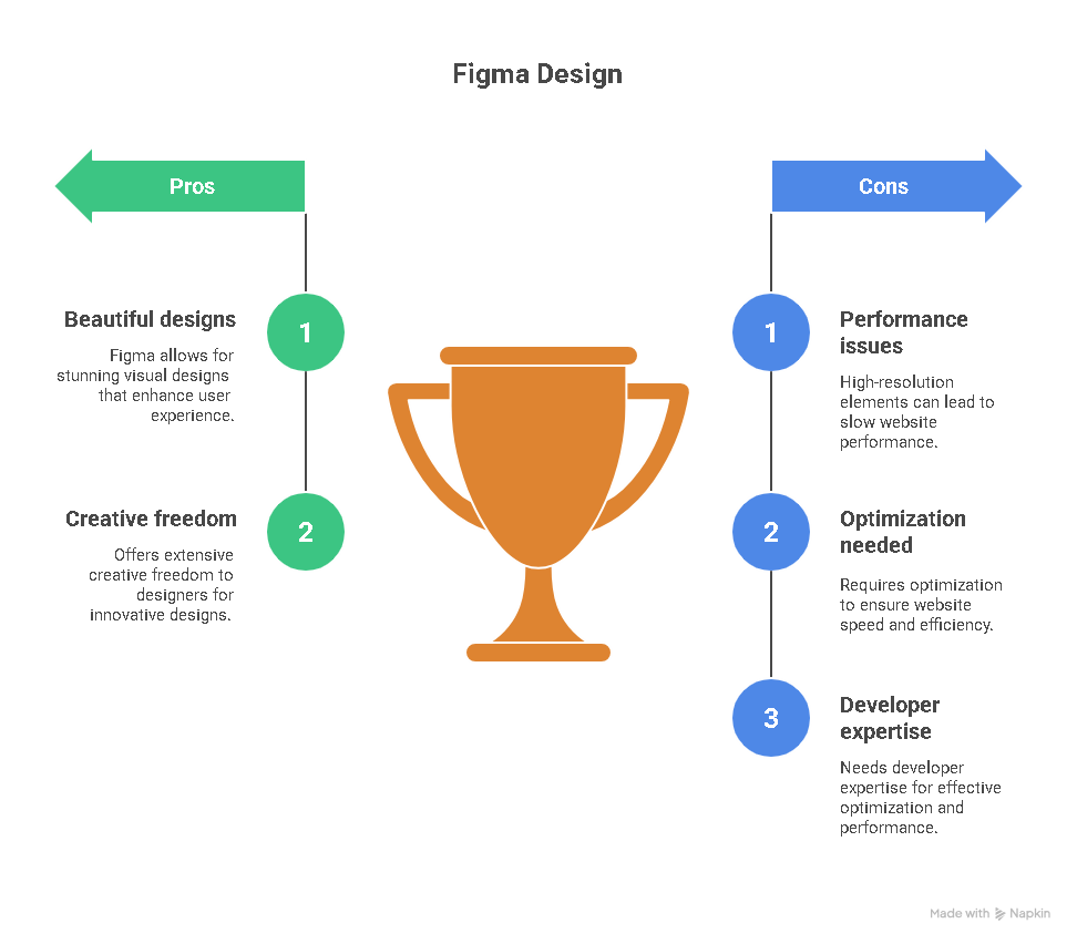 Performance: It’s easy to get carried away in Figma, adding high-resolution images, complex vector graphics, and intricate animations. But every element you add has a cost in terms of performance. A design that looks beautiful in Figma can result in a slow, bloated website if not optimized correctly. This is where the expertise of a developer is crucial, as they can make informed decisions about things like image compression, code minification, and caching to ensure your website is not only beautiful but also fast and efficient.
