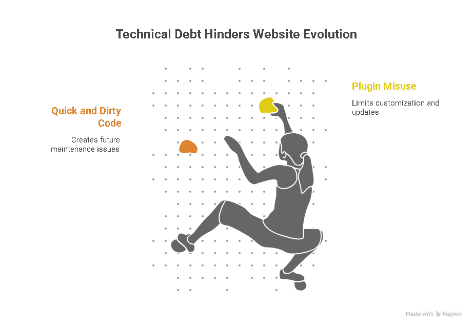 Technical Debt: In the rush to get a website live, it’s tempting to take shortcuts. Maybe you use a plugin that almost does what you want, or you write some quick and dirty code to fix a layout issue. While these solutions might work in the short term, they can lead to a mountain of technical debt down the road, making your website difficult to maintain, update, and scale.